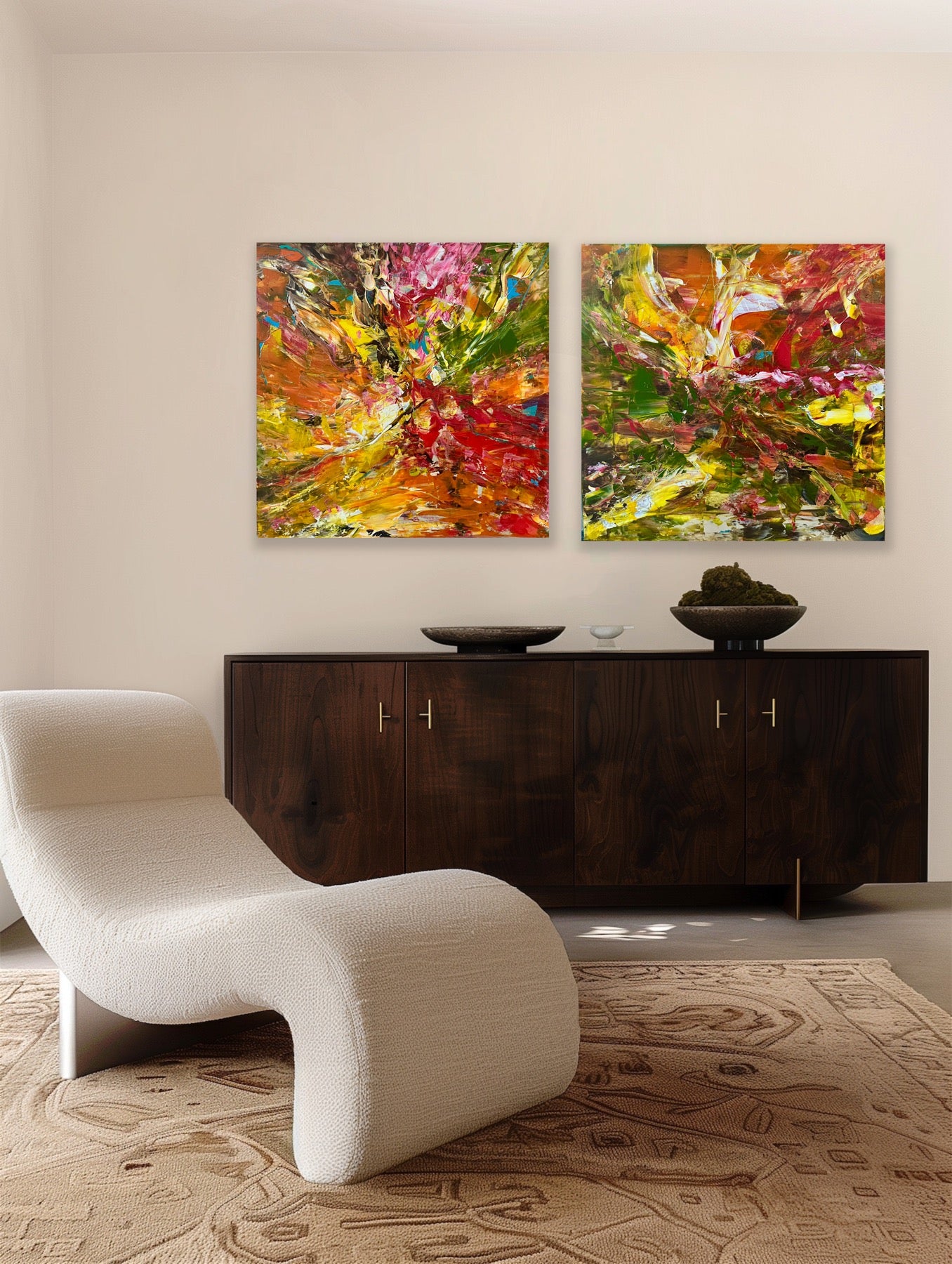 Jeg har flere malerier klar i atelieret, som kan lånes med hjem, og jeg maler også på bestilling, hvis du har specifikke ønsker til størrelse og stil.